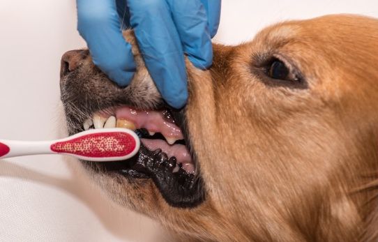 To keep bacteria and plaque from building up on your dog's teeth, brush them daily with toothpaste and a toothbrush made especially for canines.